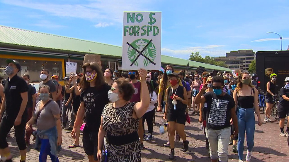 星期四,抗议者聚集在西雅图市中心的几个星巴克门店,要求星巴克从西雅图警察局基金会撤资。