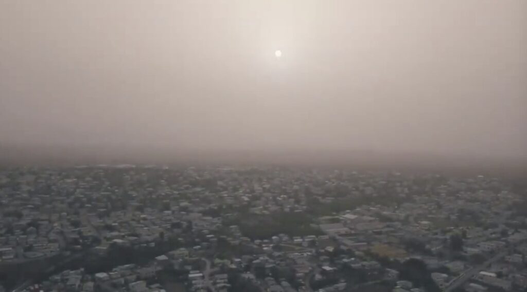 国家气象局说:“撒哈拉沙漠的灰尘的主要表现是白天天空变灰白,日落变红以及空气质量下降。”