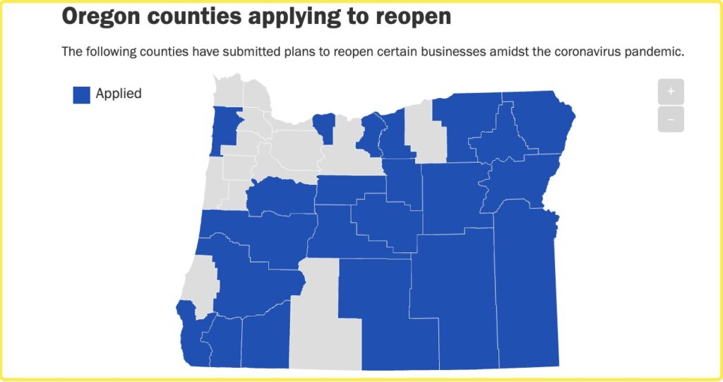 截至星期一,俄勒冈州已经有22个县提出申请,要求重启经济活动。如无意外,这些县在5月15日将重新开放。