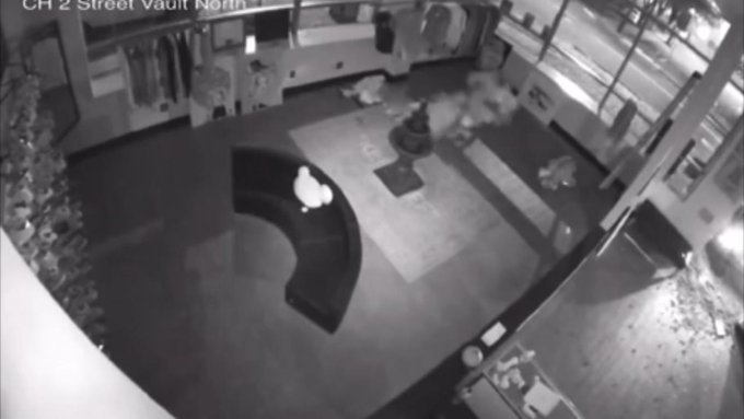 视频显示,盗贼直接用汽车将大门撞烂,再冲进店里大肆搜刮!