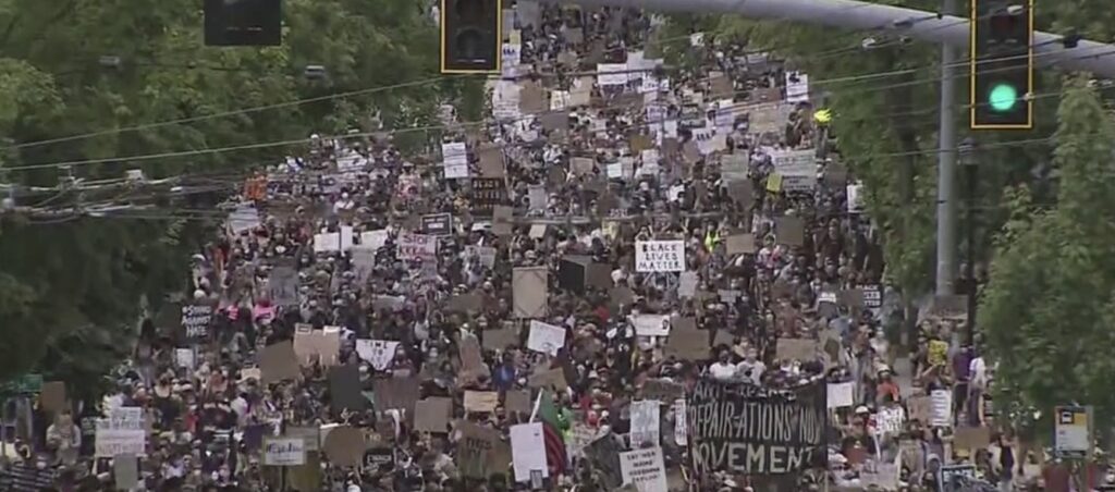 6月19日华盛顿州西雅图消息。成千上万的人,密密麻麻,走上街头,参加奴隶解放日庆祝活动。这个节日是庆祝在1865年的一天,所有奴隶得知他们解放。