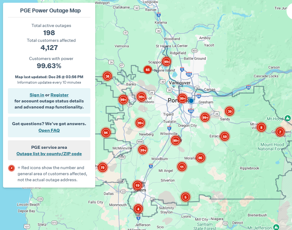 清晨5点45分,波特兰通用电力公司(PGE)报告称,其服务区域内有347个活跃停电点,影响超过2.3万名客户。同时,太平洋电力公司(Pacific Power)报告了257处停电,波及超过1.3万用户。