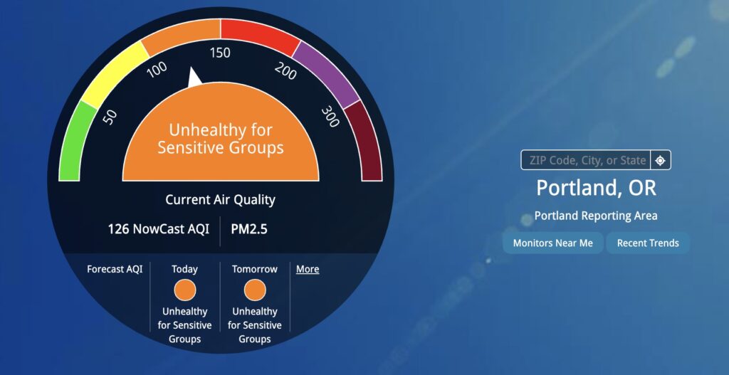 媒体报道说,由于大波特兰、西林、尤金靠近野火,周末还是笼罩浓烟的。