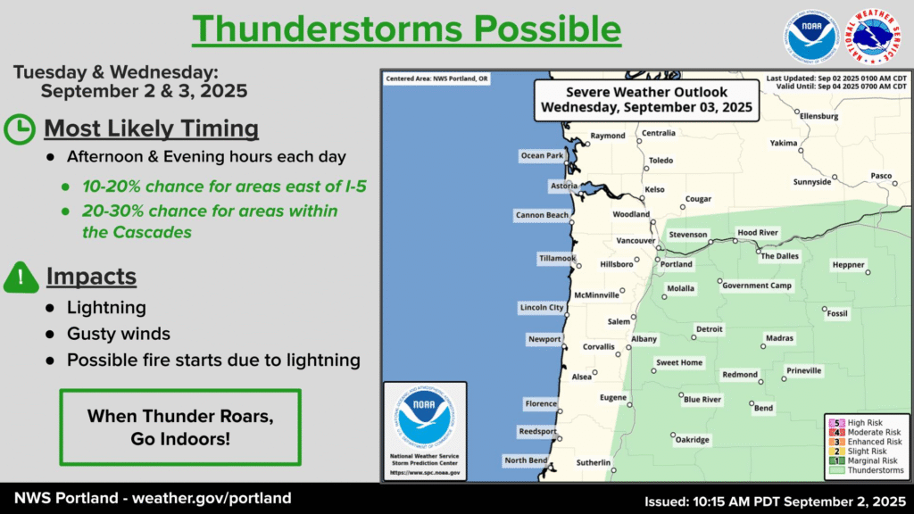 - 根据NWS波特兰分局的消息,州内I-5公路以东地区星期二下午和晚间有10%至20%的雷暴几率,而喀斯喀特山脉一带则提高至20%至30%。