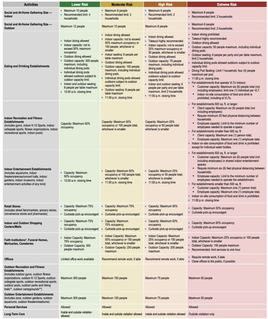 餐馆、酒吧、和其他饮食场所,室外用餐不能超过50人,每张桌子不能超过6人且不得超两个家庭。强烈推荐外卖外送。没有室内用餐!晚上11点关门。