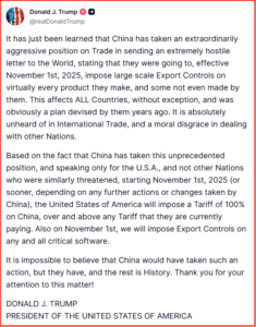 特朗普10月10日星期五宣布,美国将从 11月1日 起,对来自中国的所有进口商品 额外加征100%关税,并同时对“中国关键软件”实施出口管制!