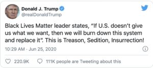 特朗普在推特上说,黑人领导威胁美国满足他们的要求,如果不满意就继续烧。这是叛国,煽动叛乱,叛乱!