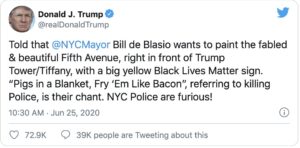 在第一条推文后,特朗普又发了第二条推特,指责纽约市长在“特朗普大厦”前面的第五大道上喷涂上“黑人生命很重要”字样。特朗普说,警察很愤怒!