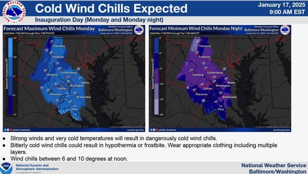 特朗普的帖子还附上了国家气象局的天气预报截图,显示周一中午华盛顿的体感温度将降至华氏6至10度之间(约摄氏-14至-12度),寒风刺骨,危险程度极高。