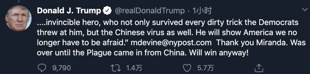 但是,他除了指责民主党的“各种卑鄙手段”外,再次提到“中国病毒”这个深深伤害在美华人的字眼……