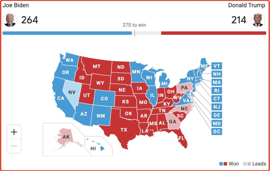 目前为止,特朗普的得票数在密歇根州(MI)落后于拜登,而在宾夕法尼亚州(PA)则遥遥领先。但分析认为,随着邮寄选票的到来,特朗普在宾夕法尼亚州(PA)领先的优势可能被吃掉。