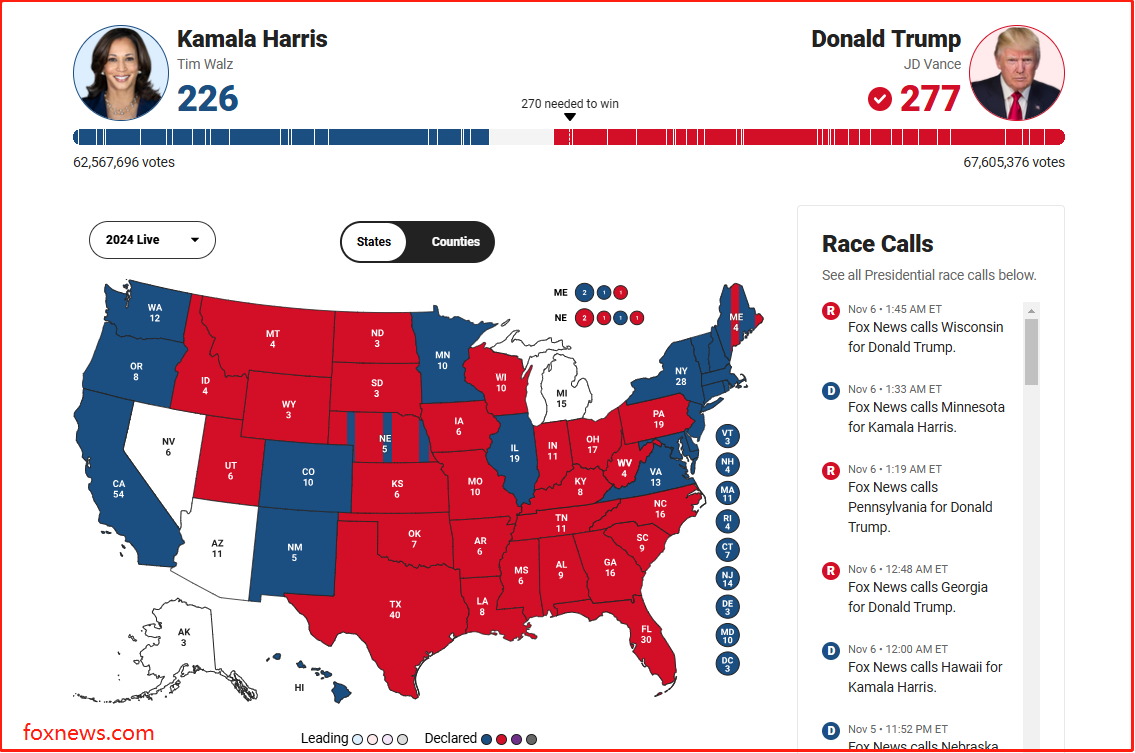截至11月6日上午,尽管全美仍有部分选票尚未统计,但特朗普已获得足够的选举人票赢得白宫,而且随着计票完成,他有望拿下所有关键州,以高票击败民主党候选人哈里斯。