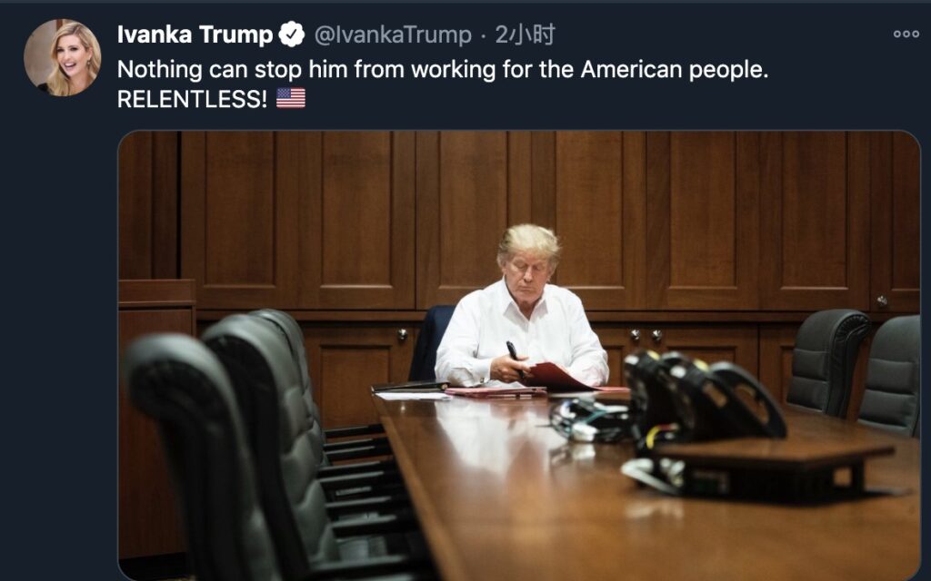 发稿的2个小时前,特朗普的女儿伊万卡在推特上发布了一张照片,显示特朗普在工作。