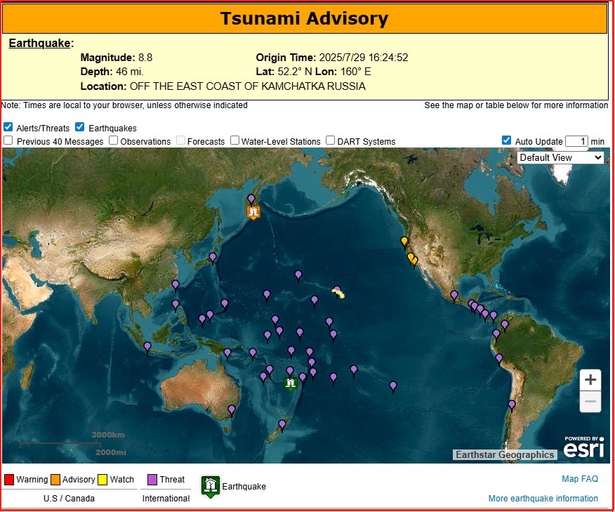 美西时间7月29日星期二下午4:30,地震发生在俄罗斯堪察加半岛彼得罗巴甫洛夫斯克(Petropavlovsk-Kamchatsky)外海。首波海啸浪潮于午夜后抵达美国西海岸。