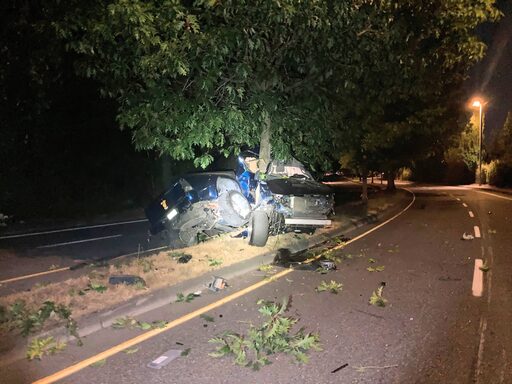 凌晨1时58分,另一宗事故发生在东北机场大道(Northeast Airport Way)与东北梅森街(Northeast Mason Street)附近。一辆丰田Tacoma皮卡高速撞树,司机被抛出车外,重伤送院,最初情况危殆,经抢救已转为无生命危险。警方怀疑车速过快及酒驾是事故原因,案件编号:25-215655。