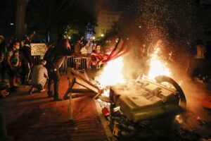 在费城,抗议者向警察投掷石块和燃烧瓶。而在加州的20多个城市,抗议者摧毁了大量商铺,抢走大部分商店,包括运动鞋,衣服,手机,电视,和其他电子产品。