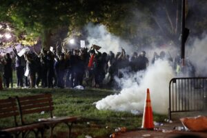 在白宫外,警察向拉法叶特公园(Lafayette Park)马路对面的1000多名抗议者发射催泪瓦斯。人群被冲走,留下了成堆的标牌,塑料屏障,和大火。有人从建筑物上拉出一片美国国旗,扔进了大火。