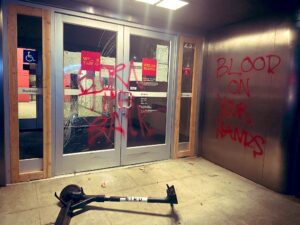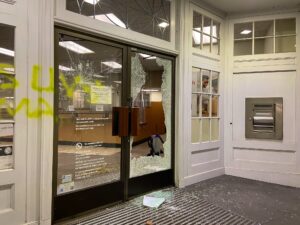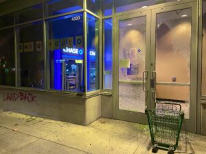 被砸的商店包括Whole Foods、美国银行等。