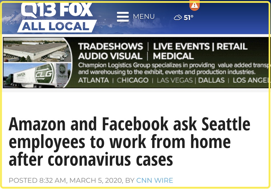 另一家科技巨头Google也向媒体表示跟进,要求在华盛顿的员工,若能在家工作的,都留在家里工作。