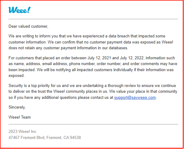 根据华人生鲜网“Weee!”的公开邮件,泄露事件影响了曾在2021年7月12日至2022年7月12日之间下单的客户!