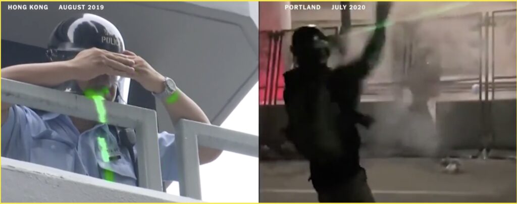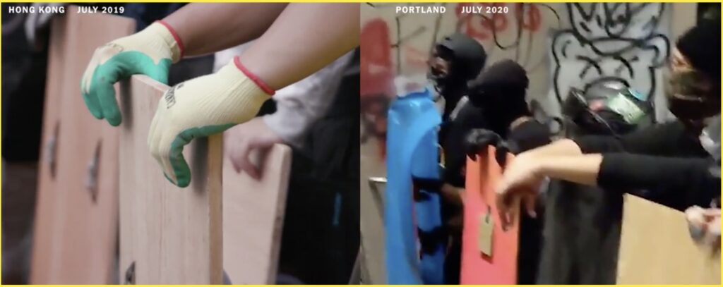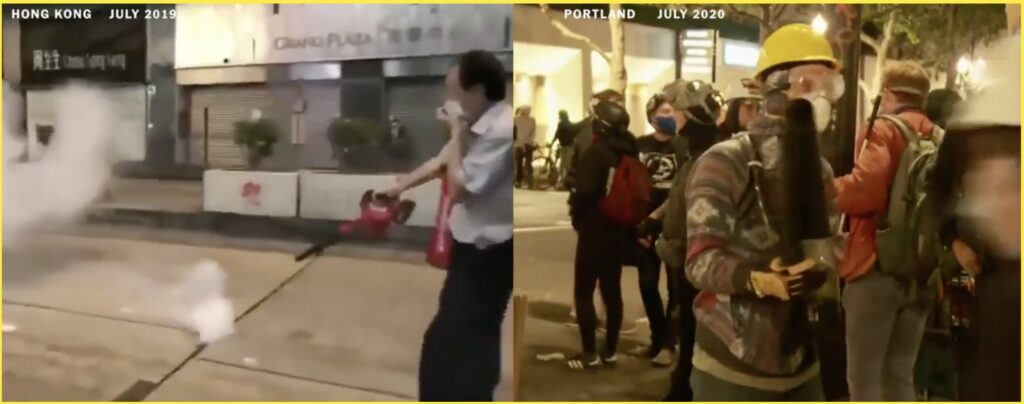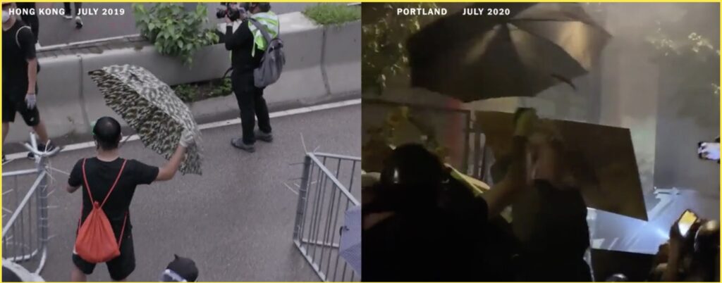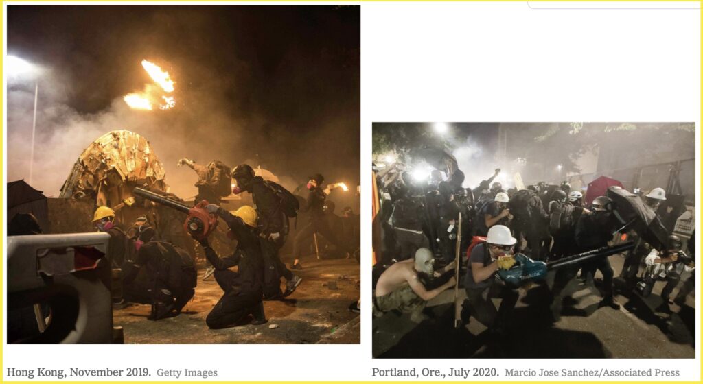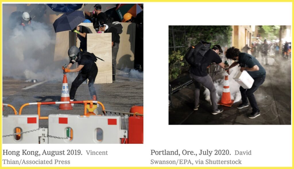 7月31日,纽约时报将2020年发生在美国波特兰的暴力抗议活动跟2019年发生在中国香港特区的暴力抗议活动作出比较,一连串图片对比,相似程序让人吃惊。