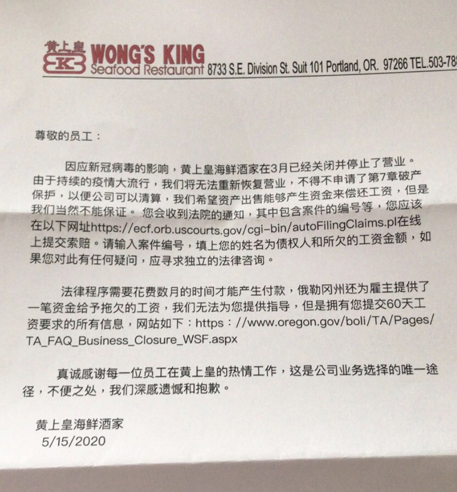 俄勒冈州 波特兰著名中餐馆黄上皇宣布破产清算 by Malldone2020年5月16日2020年5月16日 5月16日俄勒冈州波特兰消息。波特兰著名中餐馆黄上皇海鲜酒家通知其员工,由于新冠病毒的影响,已经申请破产保护。 根据黄上皇海鲜酒家给其员工的信,早在3月份,黄上皇已经暂停营业。直到今天,新冠疫情仍然没有解除。黄上皇海鲜酒家已经无法重新恢复营业,不得不申请破产,并希望能出售资产来偿还员工的工资。 黄上皇海鲜酒家是在波特兰东南区有多年历史的著名中餐馆,曾广受本地顾客热爱,没想到成为东南区受疫情影响率先申请破产的中餐企业。 ShareTweet